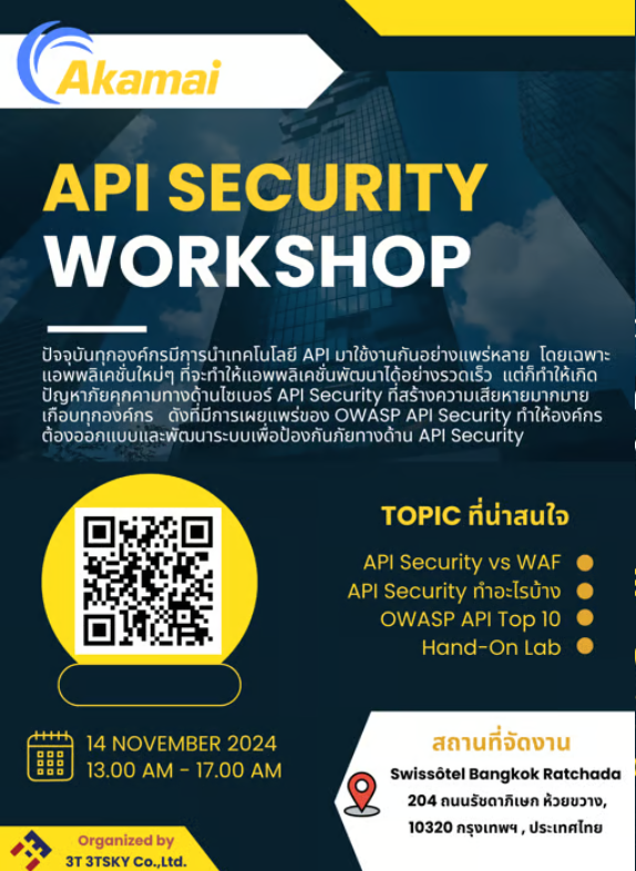 บริษัท Akamai Technology (Thailand) ร่วมกับ MFEC/3T SKY ขอเชิญเข้าร่วมงานอบรมทางเทคนิค API Security Workshop โดยการอบรมนี้จะเน้นการให้ความรู้เชิงลึกเกี่ยวกับหลักการและวิธีการรักษาความปลอดภัยของ API ซึ่งเป็นหัวใจสำคัญในการปกป้องข้อมูลและการเชื่อมต่อระหว่างระบบ เพื่อช่วยให้ท่านสามารถเพิ่มประสิทธิภาพด้านความปลอดภัยของ API ในองค์กรได้อย่างมีประสิทธิภาพ รายละเอียดการอบรม วันพฤหัสบดีที่ 14 พฤศจิกายน 2567 เวลา: 13:00 – 17:00 น. ณ Swissotel Bangkok Ratchada